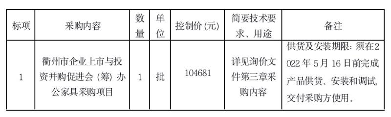 參照《中華人民共和國政府采購法》、《政府采購貨物和服務(wù)招標(biāo)投標(biāo)管理辦法》等規(guī)定,衢州市智信工程咨詢有限公司受衢州市智慧置業(yè)有限公司的委托,就衢州市企業(yè)上市與投資并購促進(jìn)會(huì)(籌)辦公家具采購項(xiàng)目進(jìn)行詢價(jià),本項(xiàng)目為非依法必招項(xiàng)目,現(xiàn)請(qǐng)合格供應(yīng)商參加投標(biāo)。