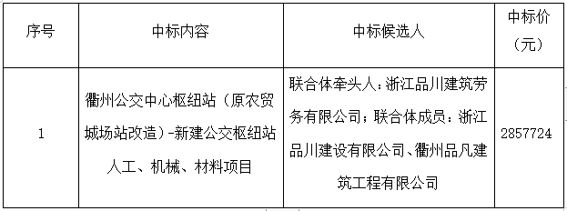 根據(jù)《中華人民共和國招標(biāo)投標(biāo)法》等有關(guān)法律法規(guī)的規(guī)定,浙江建安工程管理有限公司受浙江衢交建設(shè)工程有限公司委托,對(duì)其衢州公交中心樞紐站(原農(nóng)貿(mào)城場(chǎng)站改造)-新建公交樞紐站人工、機(jī)械、材料項(xiàng)目采用公開招標(biāo)方式進(jìn)行招標(biāo)。浙江建安工程管理有限公司于2021年6月17日09時(shí)30分在衢州市交通投資集團(tuán)二樓開標(biāo)廳(衢州市柯城區(qū)白云街道花園中大道86號(hào))進(jìn)行開評(píng)標(biāo)。評(píng)標(biāo)結(jié)果及相關(guān)事宜現(xiàn)公示如下: