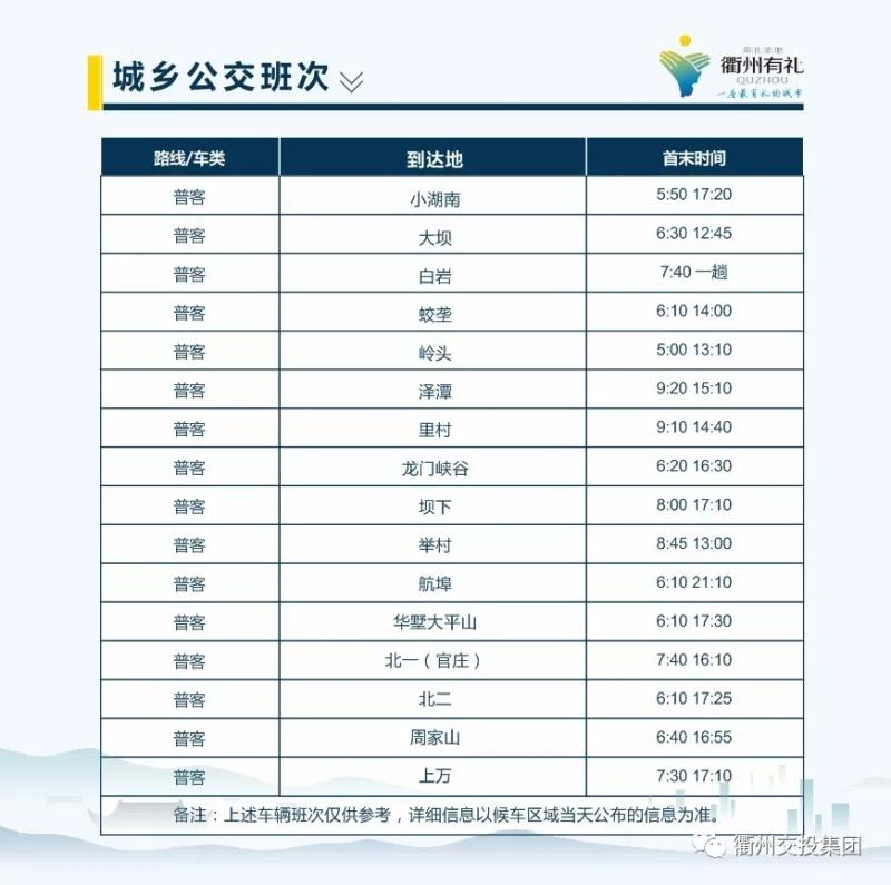 城際公交共設(shè)置班線4條,分別前往龍游、江山、常山、開化等各縣(市),平均30分鐘便有一趟發(fā)車。