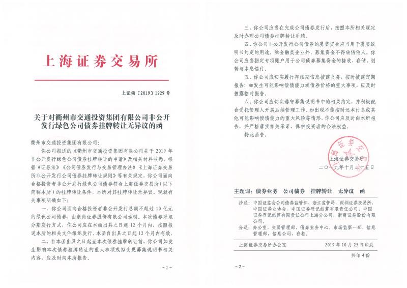10月25日,市交投集團(tuán)取得上海證券交易所的掛牌轉(zhuǎn)讓無異議函,成功獲批非公開發(fā)行10億元綠色公司債券,期限不超過5年。成為我市首個獲批發(fā)行非公開綠色公司債券的企業(yè)。
