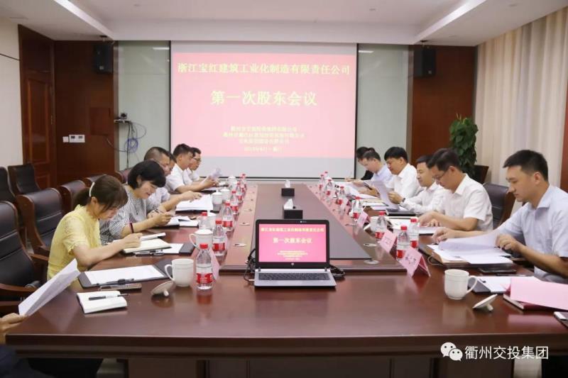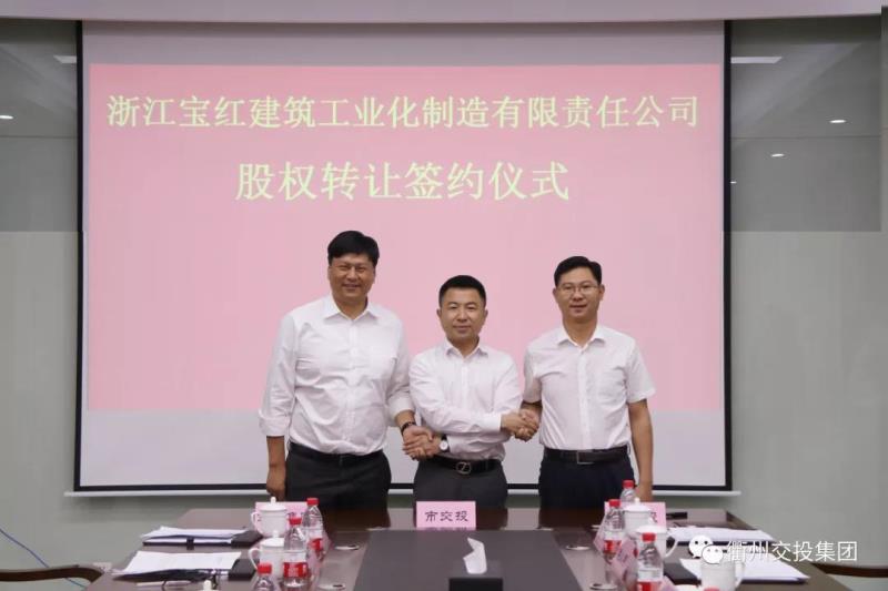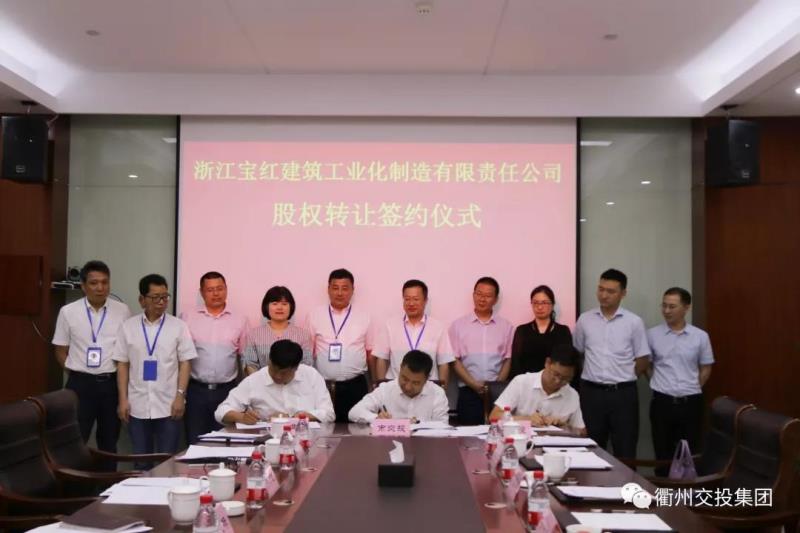 2019年6月6日11時18分,浙江寶紅建筑工業(yè)化制造有限責(zé)任公司股權(quán)轉(zhuǎn)讓簽約儀式隆重舉行。市交投集團董事長方世忠、衢江建投總經(jīng)理黃利、寶業(yè)集團總經(jīng)理龐巍祥、寶紅公司總經(jīng)理婁忠華等出席儀式并參加簽約。