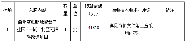 參照《中華人民共和國政府采購法》、《政府采購貨物和服務(wù)招標(biāo)投標(biāo)管理辦法》等規(guī)定,衢州市智信工程咨詢有限公司受衢州市智慧產(chǎn)業(yè)投資發(fā)展有限公司的委托,就衢州高鐵新城智慧產(chǎn)業(yè)園(一期)北區(qū)無障礙改造項目進(jìn)行詢價,本項目為非依法必招項目,現(xiàn)請合格供應(yīng)商參加投標(biāo)。