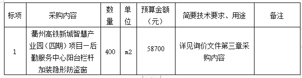 根據(jù)《衢州市國有企業(yè)采購管理辦法(試行)》規(guī)定,衢州市智信工程咨詢有限公司受衢州市智慧產(chǎn)業(yè)投資發(fā)展有限公司的委托,就衢州高鐵新城智慧產(chǎn)業(yè)園(四期)項目—后勤服務中心陽臺欄桿加裝隱形防盜窗進行詢價,本項目為非依法必招項目,現(xiàn)請合格供應商參加投標。