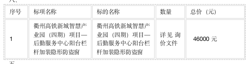 二、項目名稱:衢州高鐵新城智慧產業(yè)園(四期)項目—后勤服務中心陽臺欄桿加裝隱形防盜窗