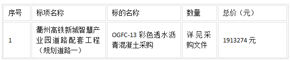 二、項目名稱:衢州高鐵新城智慧產(chǎn)業(yè)園道路配套工程(規(guī)劃道路一)OGFC-13彩色透水瀝青混凝土采購項目