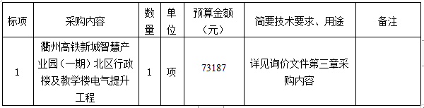參照《中華人民共和國(guó)政府采購(gòu)法》、《政府采購(gòu)貨物和服務(wù)招標(biāo)投標(biāo)管理辦法》等規(guī)定,衢州市智信工程咨詢有限公司受衢州市智慧產(chǎn)業(yè)投資發(fā)展有限公司的委托,就衢州高鐵新城智慧產(chǎn)業(yè)園(一期)北區(qū)行政樓及教學(xué)樓電氣提升工程進(jìn)行詢價(jià),本項(xiàng)目為非依法必招項(xiàng)目,現(xiàn)請(qǐng)合格供應(yīng)商參加投標(biāo)。
