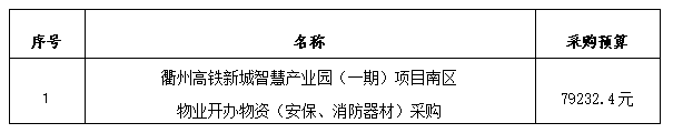 一、采購項(xiàng)目名稱:衢州高鐵新城智慧產(chǎn)業(yè)園(一期)南區(qū)物業(yè)開辦物資(安保、消防器材)采購。