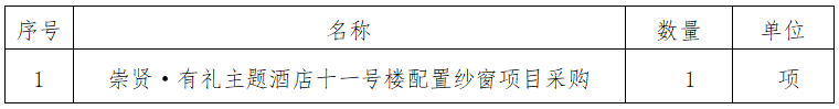 一、采購(gòu)項(xiàng)目名稱:崇賢·有禮主題酒店十一號(hào)樓配置紗窗項(xiàng)目