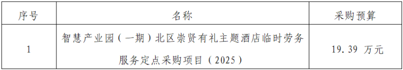 一、采購項目名稱:智慧產(chǎn)業(yè)園(一期)北區(qū)崇賢·有禮主題酒店臨時勞務(wù)服務(wù)定點采購。