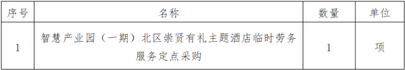 一、采購項(xiàng)目名稱:智慧產(chǎn)業(yè)園(一期)北區(qū)崇賢有禮主題酒店臨時(shí)勞務(wù)服務(wù)定點(diǎn)采購