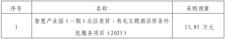 一、采購項目名稱:智慧產(chǎn)業(yè)園(一期)北區(qū)崇賢·有禮主題酒店勞務外包服務項目