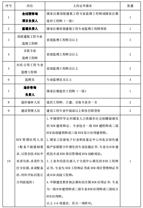 注:1.以上項(xiàng)目管理人員中全過(guò)程咨詢(xún)項(xiàng)目負(fù)責(zé)人、監(jiān)理負(fù)責(zé)人、造價(jià)咨詢(xún)負(fù)責(zé)人在投標(biāo)時(shí)必須確定并提供相關(guān)材料,其余人員及材料可中標(biāo)后簽訂合同前提供。2.所有人員應(yīng)按合同承諾要求到位履約。3. 浙江省監(jiān)理工程師證書(shū)(指浙江省建設(shè)工程監(jiān)理管理協(xié)會(huì)頒發(fā)的浙江省監(jiān)理工程師“培訓(xùn)合格證”或衢州市建筑業(yè)行業(yè)協(xié)會(huì)頒發(fā)的專(zhuān)業(yè)監(jiān)理工程師“培訓(xùn)合格證”或浙江省設(shè)區(qū)市監(jiān)理協(xié)會(huì)頒發(fā)的專(zhuān)業(yè)監(jiān)理工程師“培訓(xùn)合格證”)。