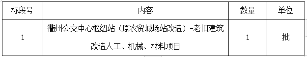 二、項(xiàng)目名稱(chēng):衢州公交中心樞紐站(原農(nóng)貿(mào)城場(chǎng)站改造)-老舊建筑改造人工、機(jī)械、材料項(xiàng)目