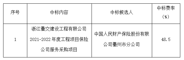根據(jù)《中華人民共和國招標(biāo)投標(biāo)法》等有關(guān)法律法規(guī)的規(guī)定,浙江建安工程管理有限公司受浙江衢交建設(shè)工程有限公司委托,對其浙江衢交建設(shè)工程有限公司2021-2022年度工程項(xiàng)目保險(xiǎn)公司服務(wù)采購項(xiàng)目采用公開招標(biāo)方式進(jìn)行招標(biāo)。浙江建安工程管理有限公司于2021年08月17日09時(shí)30分在衢州市交通投資集團(tuán)二樓開標(biāo)廳(衢州市柯城區(qū)白云街道花園中大道86號)進(jìn)行開評標(biāo)。評標(biāo)結(jié)果及相關(guān)事宜現(xiàn)公示如下: