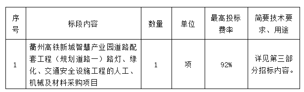 二、項(xiàng)目名稱:衢州高鐵新城智慧產(chǎn)業(yè)園道路配套工程(規(guī)劃道路一)路燈、綠化、交通安全設(shè)施工程的人工、機(jī)械及材料采購項(xiàng)目