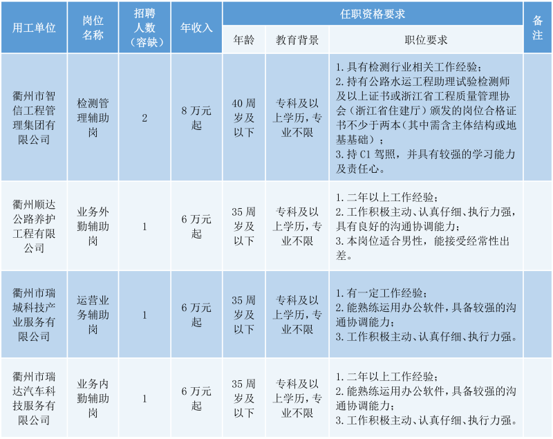 檢測管理輔助崗2人、業(yè)務(wù)外勤輔助崗1人、運(yùn)營業(yè)務(wù)輔助崗1人、業(yè)務(wù)內(nèi)勤輔助崗1人。