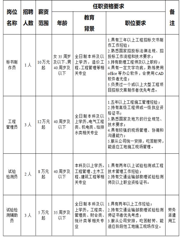 衢州市交通投資集團(tuán)有限公司根據(jù)集團(tuán)發(fā)展需要,擬面向社會(huì)公開(kāi)招聘工作人員,具體工作單位由集團(tuán)根據(jù)工作需要,在集團(tuán)本部和全資子公司之間進(jìn)行統(tǒng)籌安排。具體招聘事項(xiàng)公告如下: