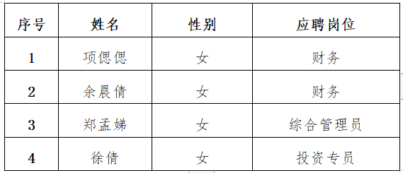 根據(jù)《衢州市交通投資集團有限公司招聘工作方案》要求,現(xiàn)將擬錄用人員名單公示如下: