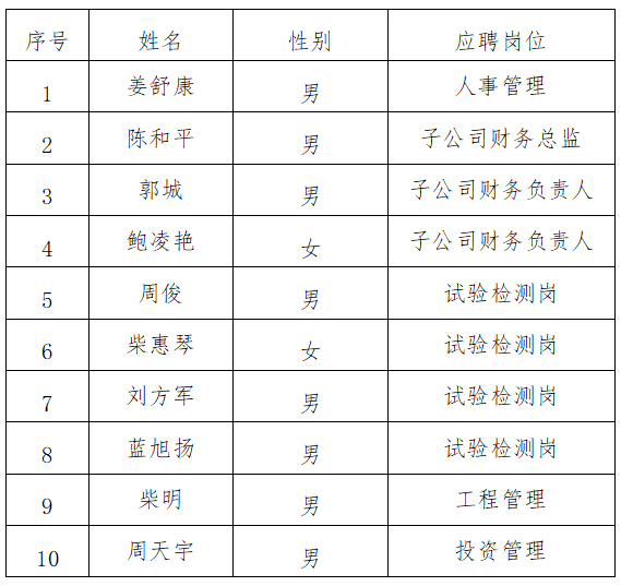 根據(jù)《衢州市交通投資集團有限公司招聘公告》要求,現(xiàn)將擬錄用人員名單公示如下: