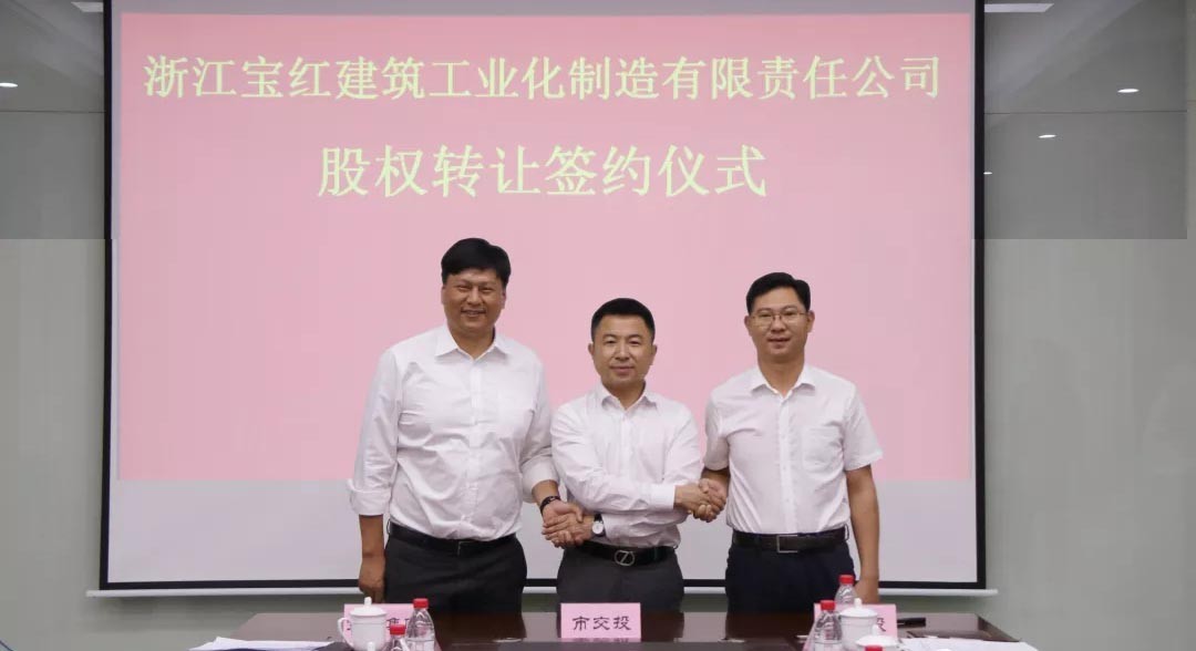 2019年6月6日11時18分,浙江寶紅建筑工業(yè)化制造有限責任公司股權(quán)轉(zhuǎn)讓簽約儀式隆重舉行。市交投集團董事長方世忠、衢江建投總經(jīng)理黃利、寶業(yè)集團總經(jīng)理龐巍祥、寶紅公司總經(jīng)理婁忠華等出席儀式并參加簽約。寶紅公司原為寶業(yè)集團全資子公司,此次股權(quán)